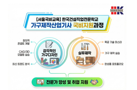 국비교육은 한국건설직업전문학교에서 ! 디자인 감각과 기술을 동시에 잡다! [ 가구제작산업기사 국비지원 과정 안내 ] 가구는 단순한 생활용품이 아닌, 공간을 완성하는 예술작품입니다. 서울 금천구 한국건설직업전문학교에서 가구제작산업기사 국비지원 과정을 통해 디자인 감각과 제작 실무 기술을 동시에 배울 수 있습니다. 실무 중심 교육으로 기초부터 가공, 마감, 완성까지 단계별로 배우며 ‘가구 제작 전문가’로 성장 할 수 있는 커리큘럼을 제공합니다!!