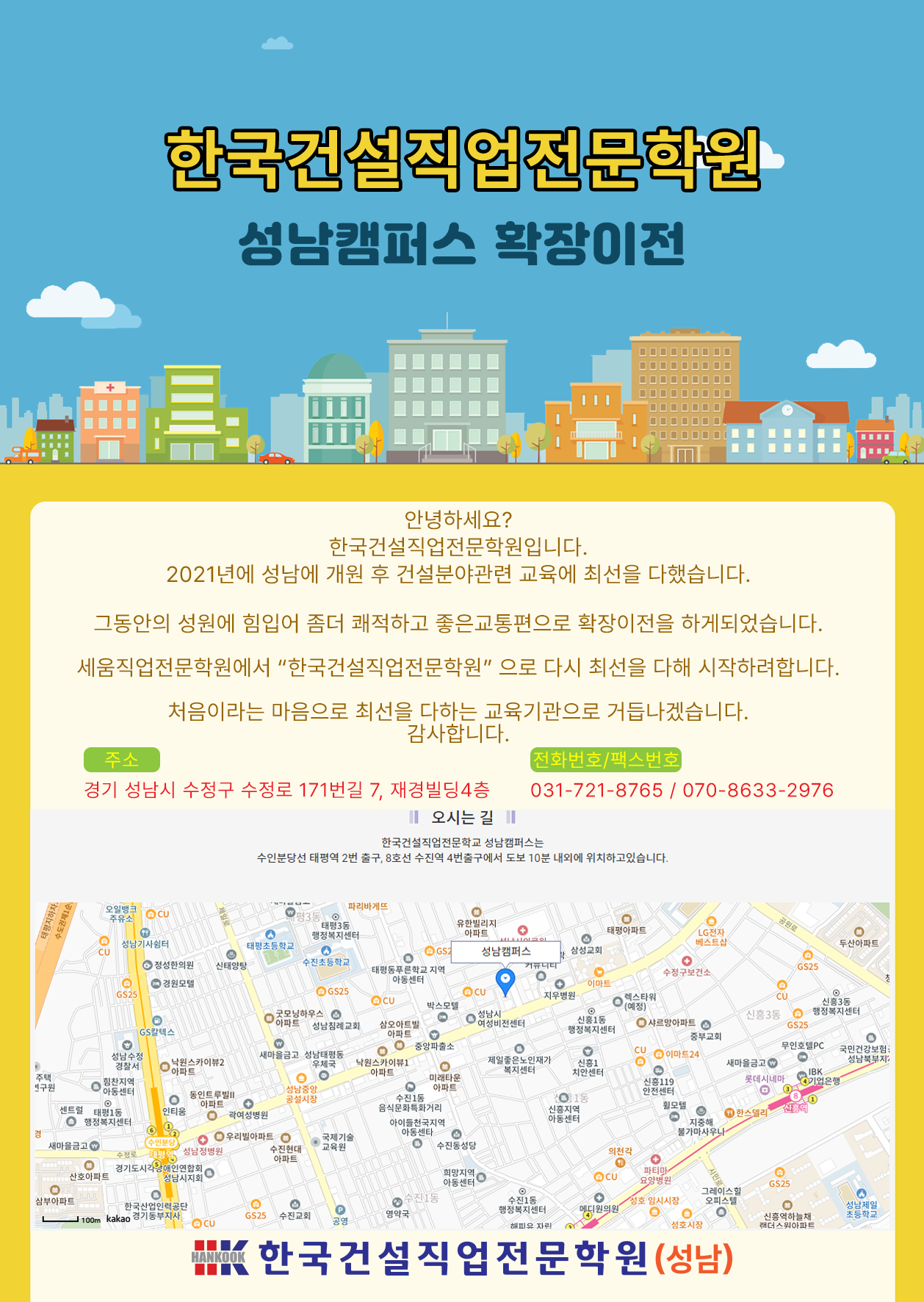 그동안 여러분들의 성원에 힘입어 "성남캠퍼스" 가 확장이전을 했습니다. 항상 최고보다는 최선을 다하는 교육기관이 되겠습니다. 감사합니다. |